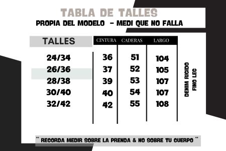 Importante: las medidas no contemplan la elasticidad. Si estás entre dos talles, elegí el más chico, ya que el jean cede con el uso.